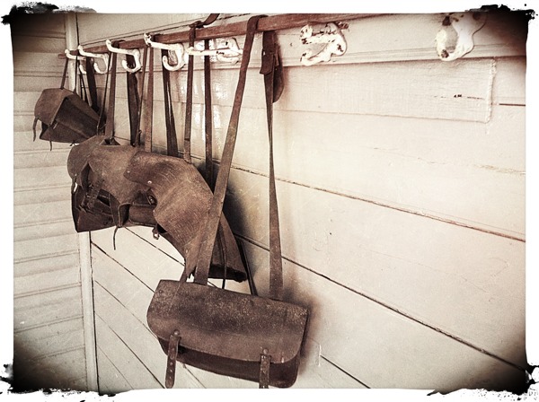The first building in the Pioneer museum was the school building. The school children would hang their bags on the hooks outside the front door and go into class.